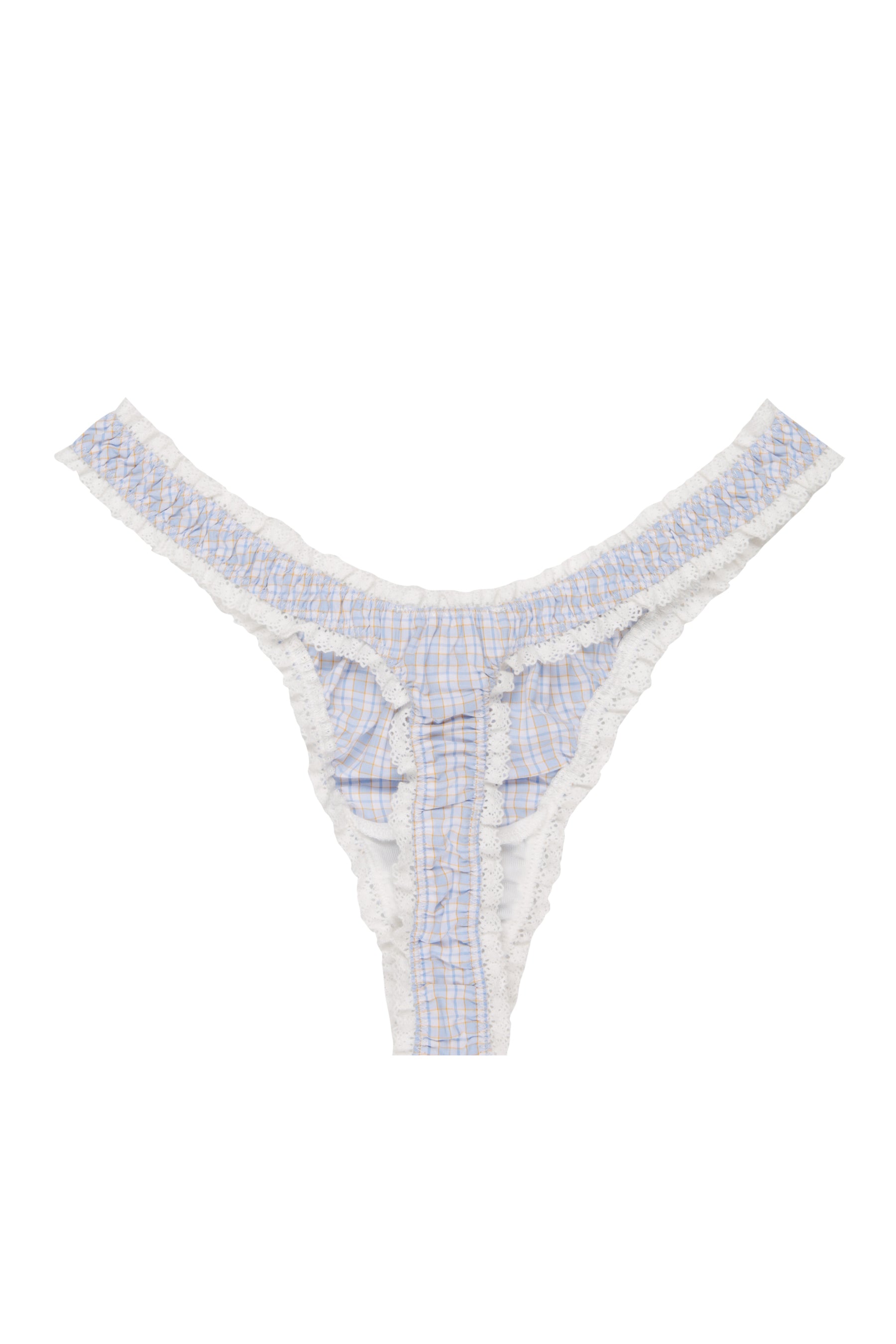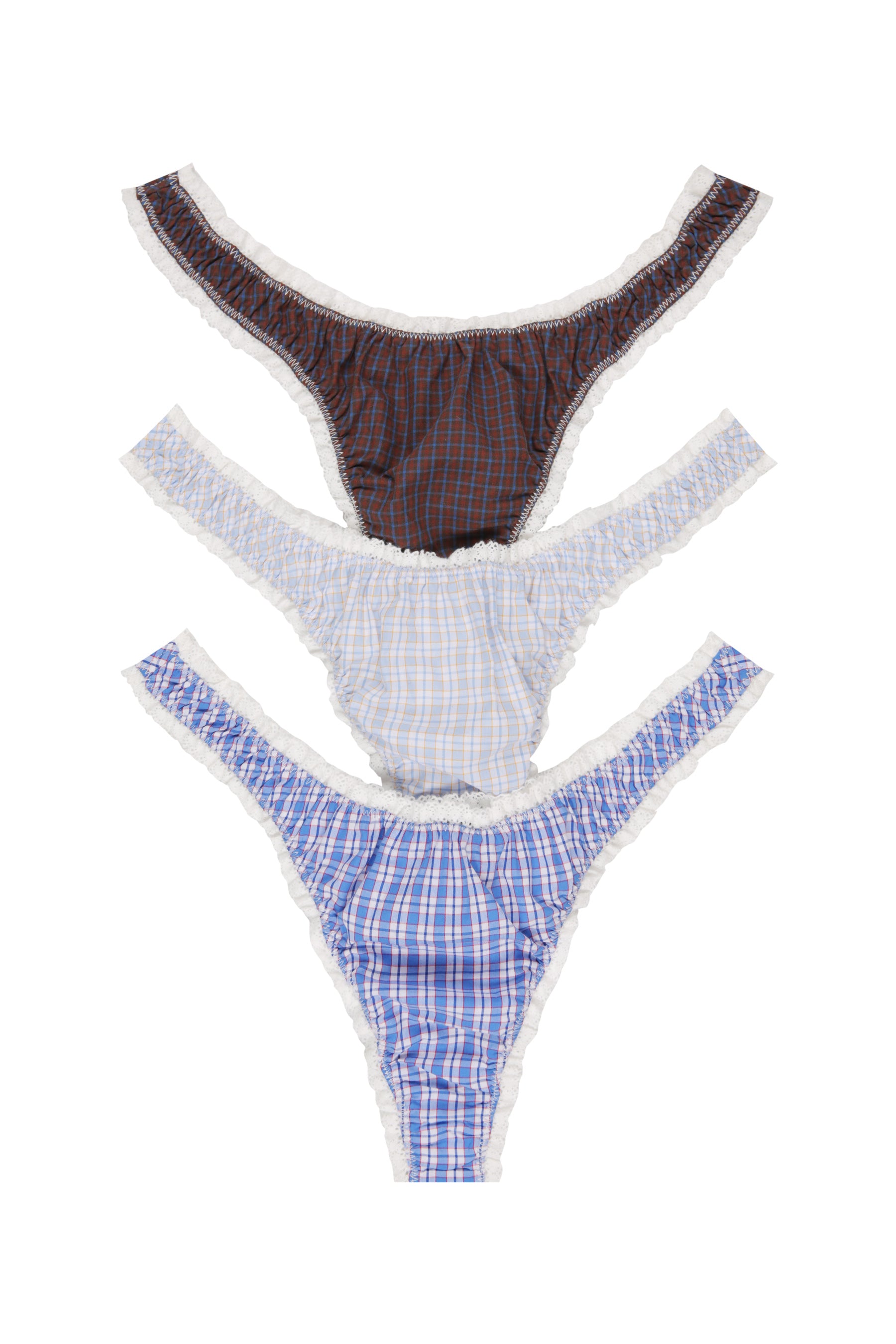 Après Studio ruched thong made from deadstock 100% cotton plaid with cotton lace trim and bamboo jersey gusset.