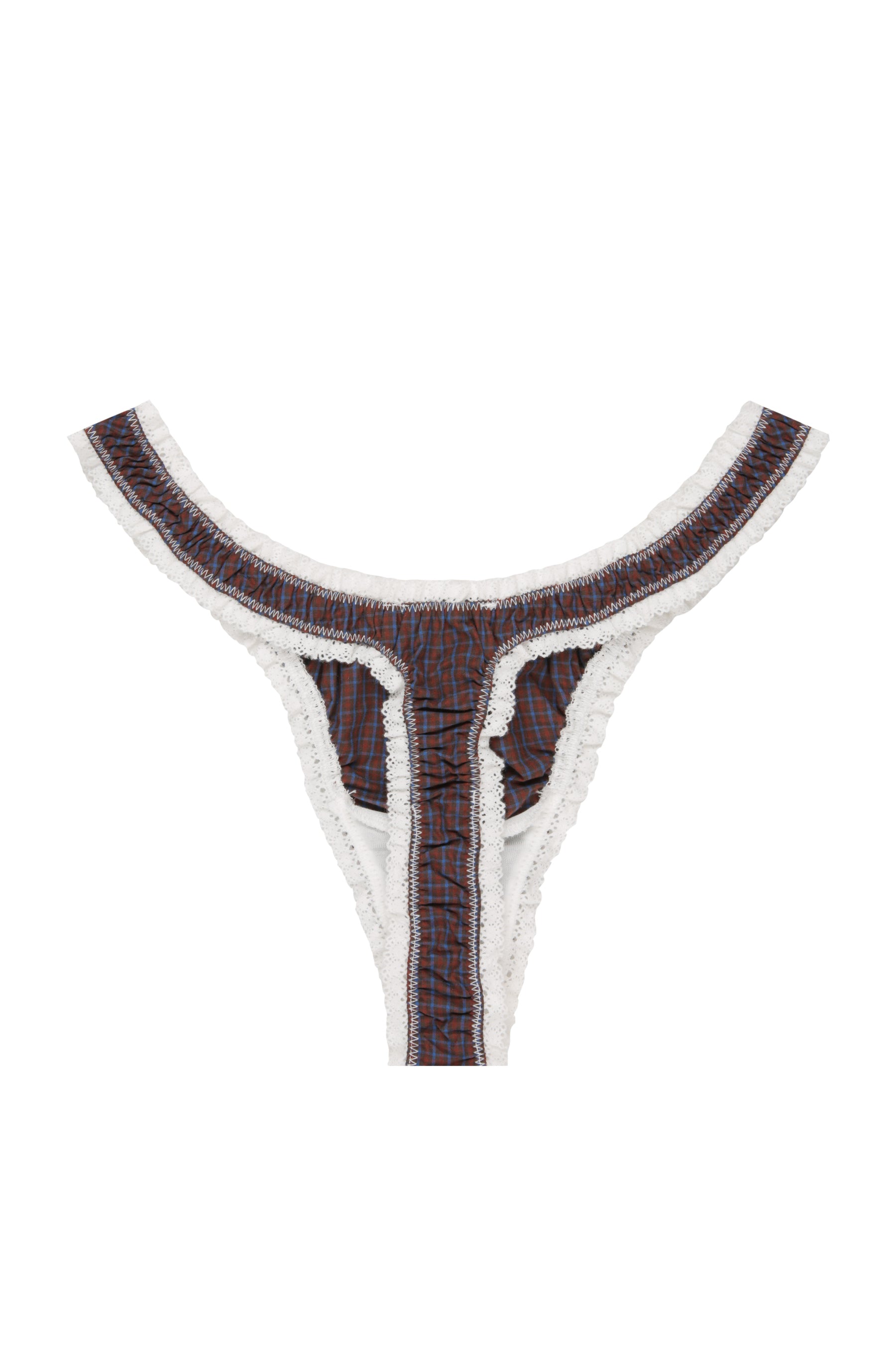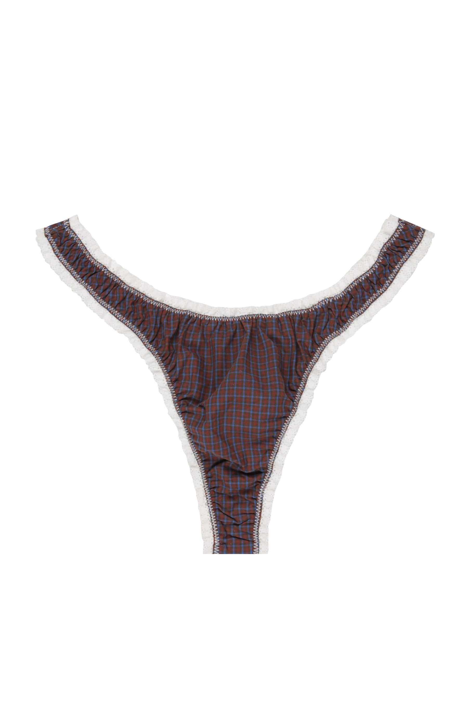 Après Studio ruched thong made from deadstock 100% cotton plaid with cotton lace trim and bamboo jersey gusset.