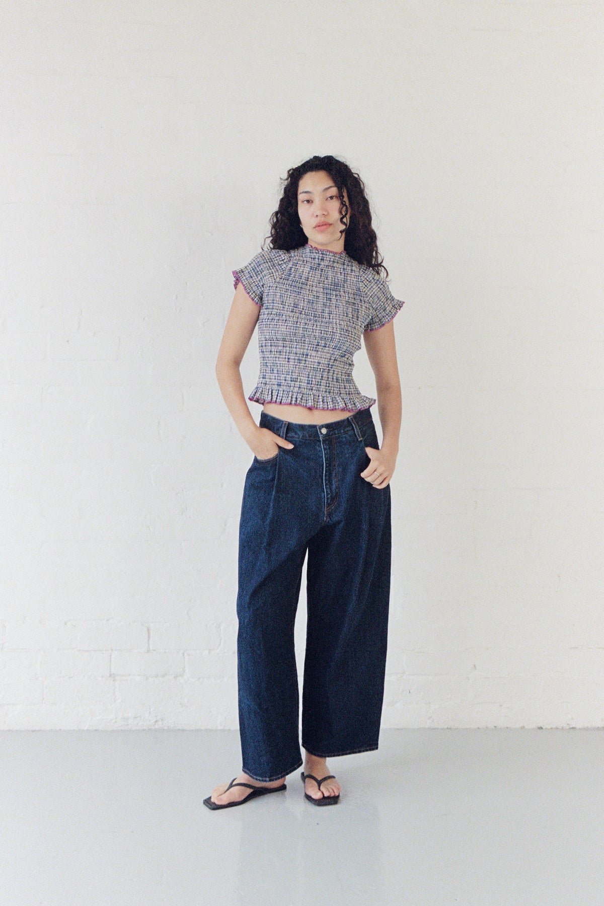 A ruched baby tee with frill finishes.