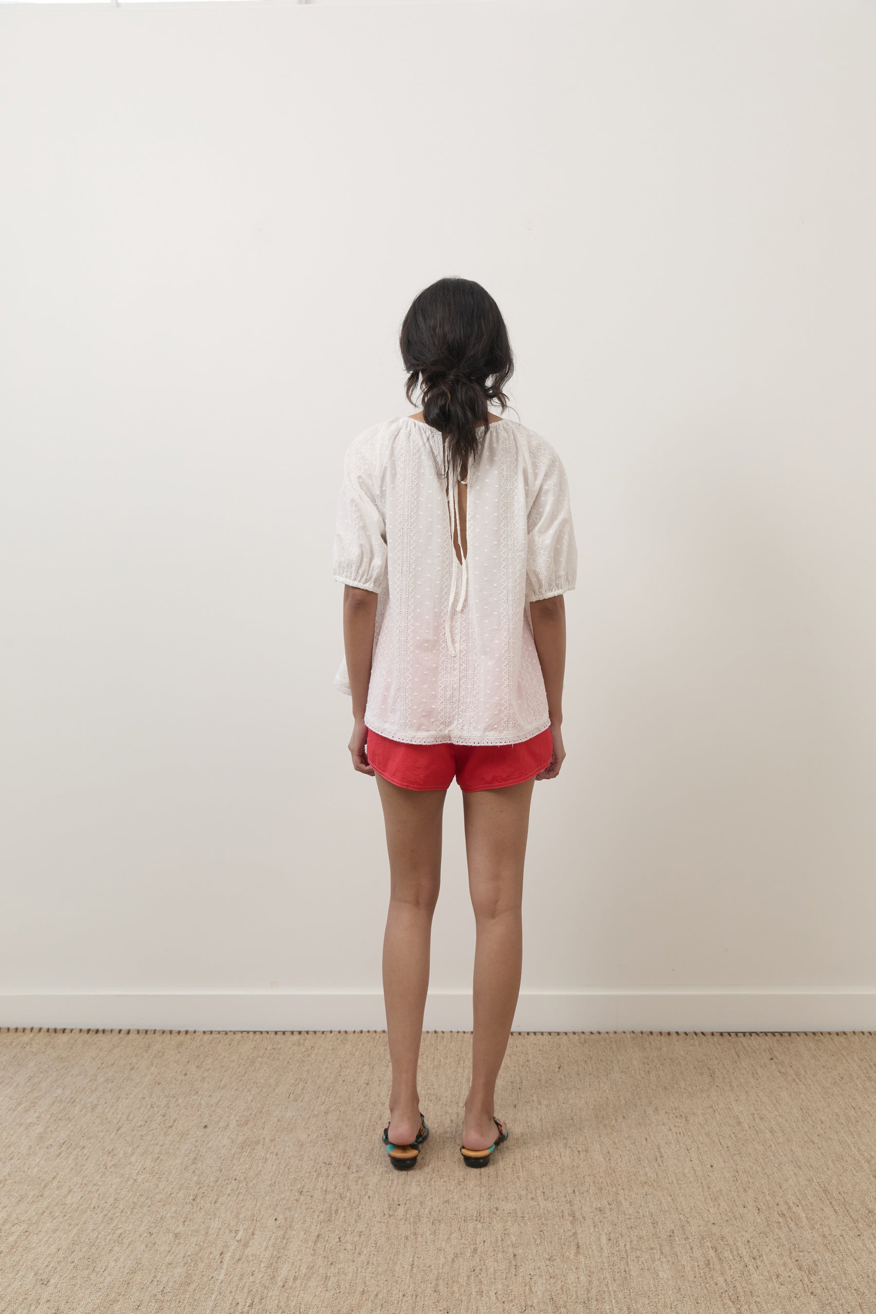 Features elasticated neckline and sleeve cuffs, with a self tie at the back.