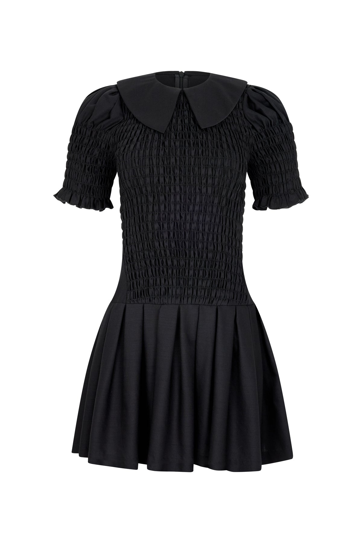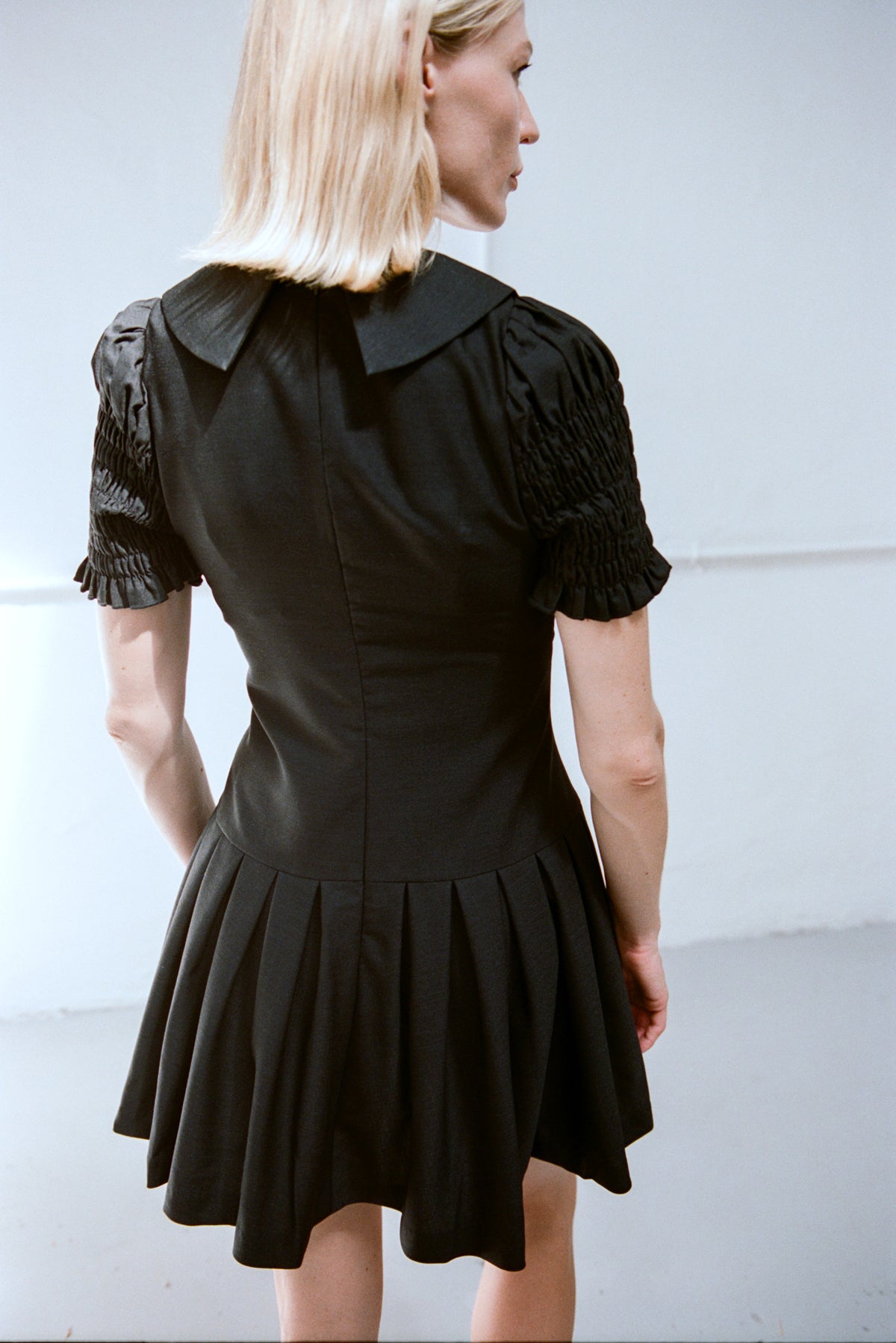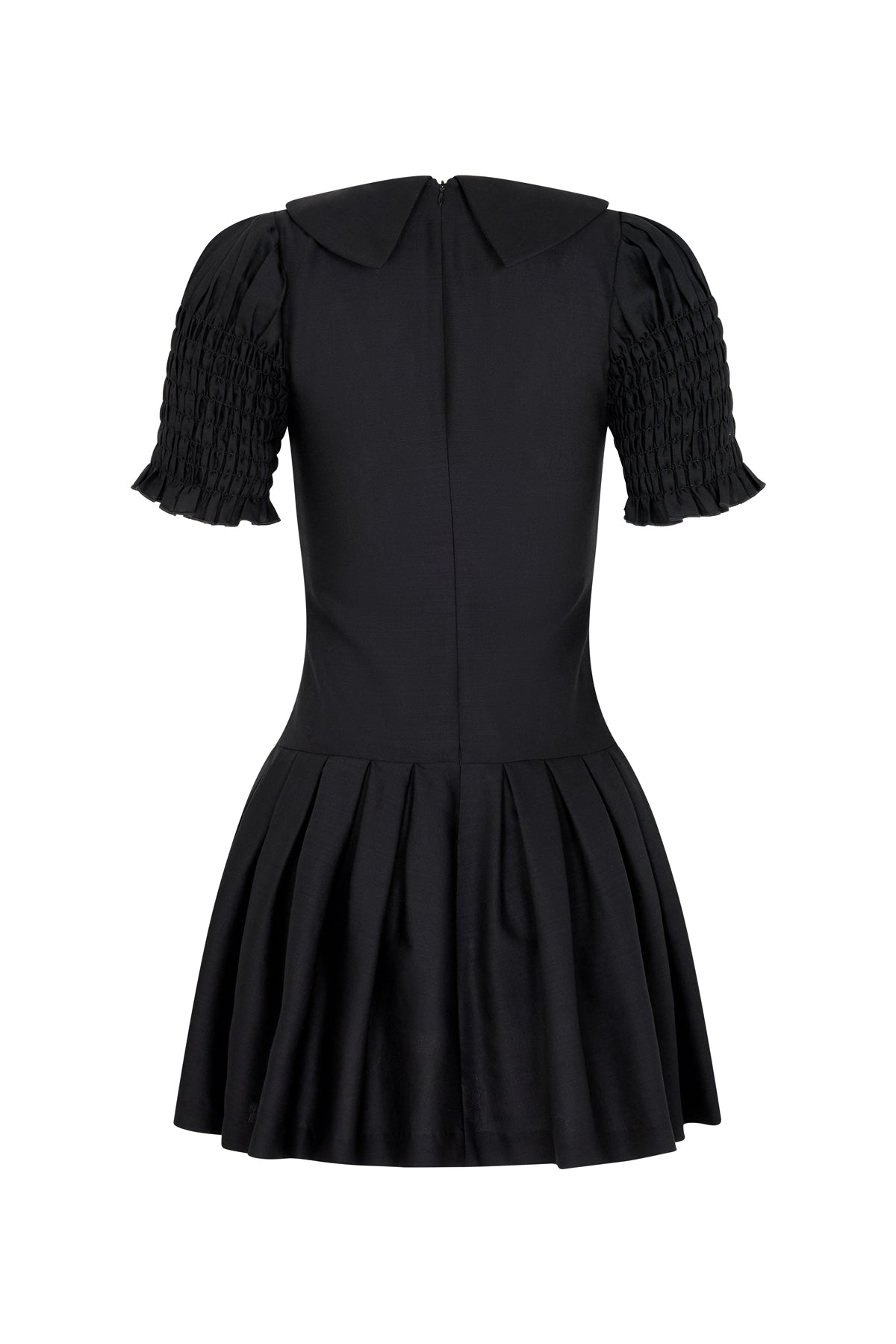 A mini length, collared dress with a dropped waist and pleated skirt made from lightweight 100% wool.