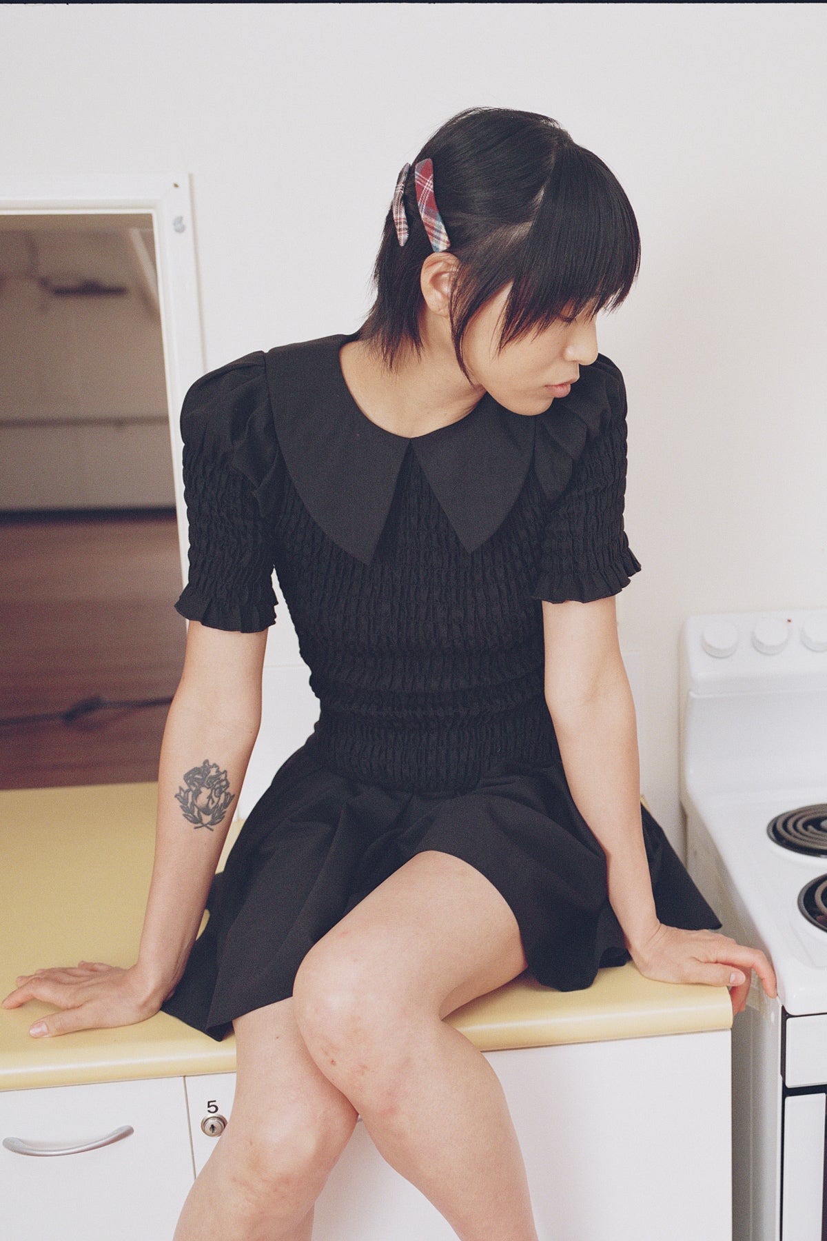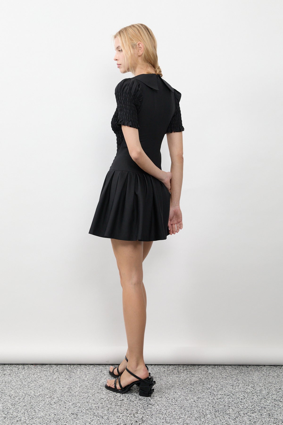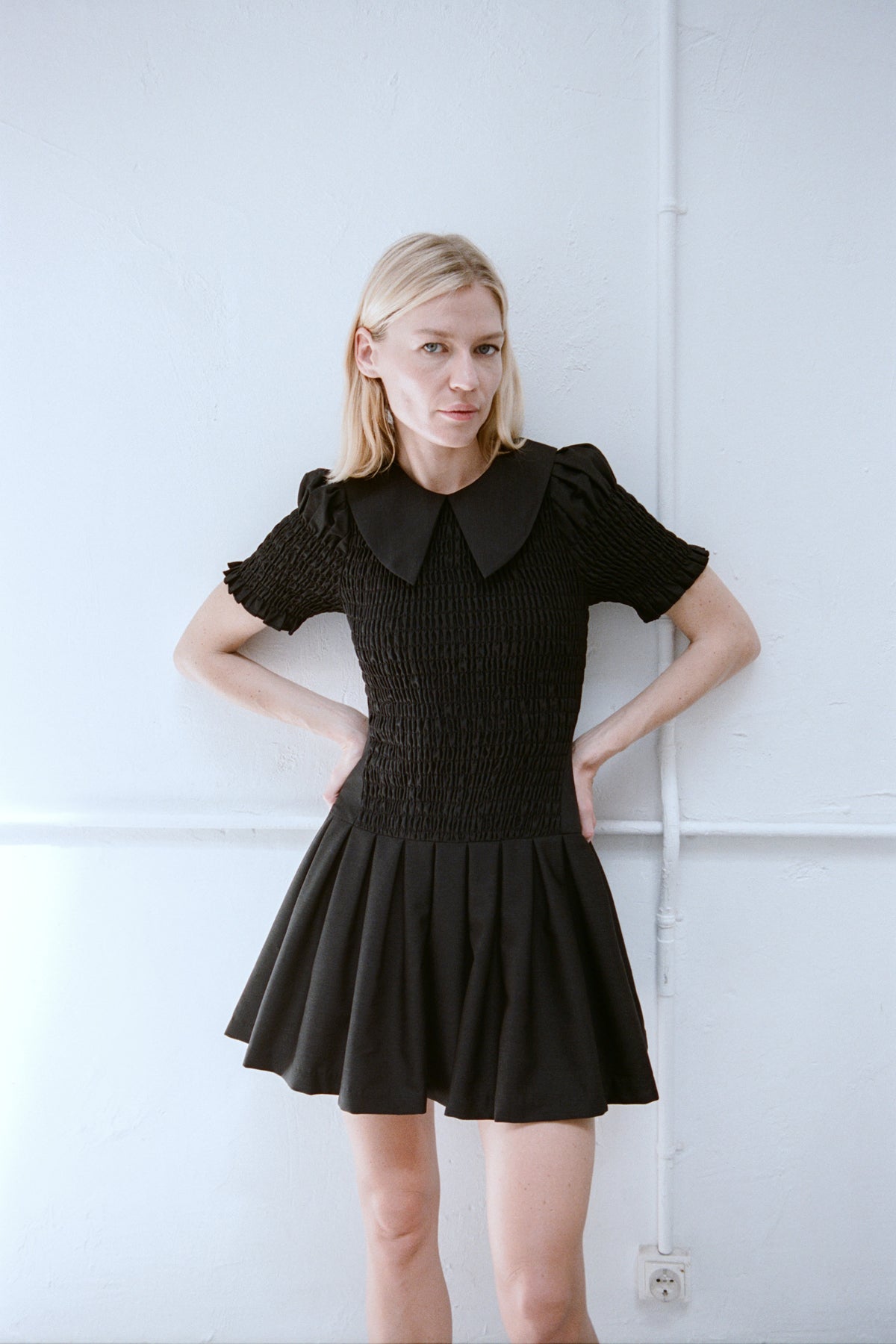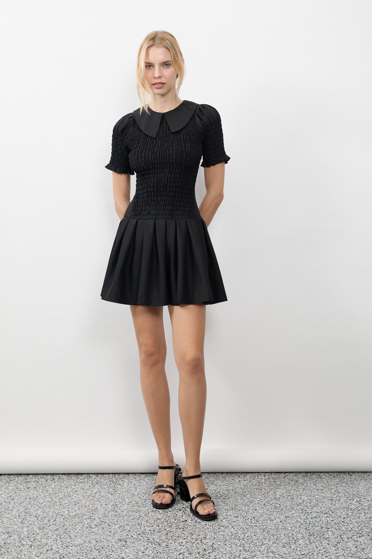A mini length, collared dress with a dropped waist and pleated skirt made from lightweight 100% wool.