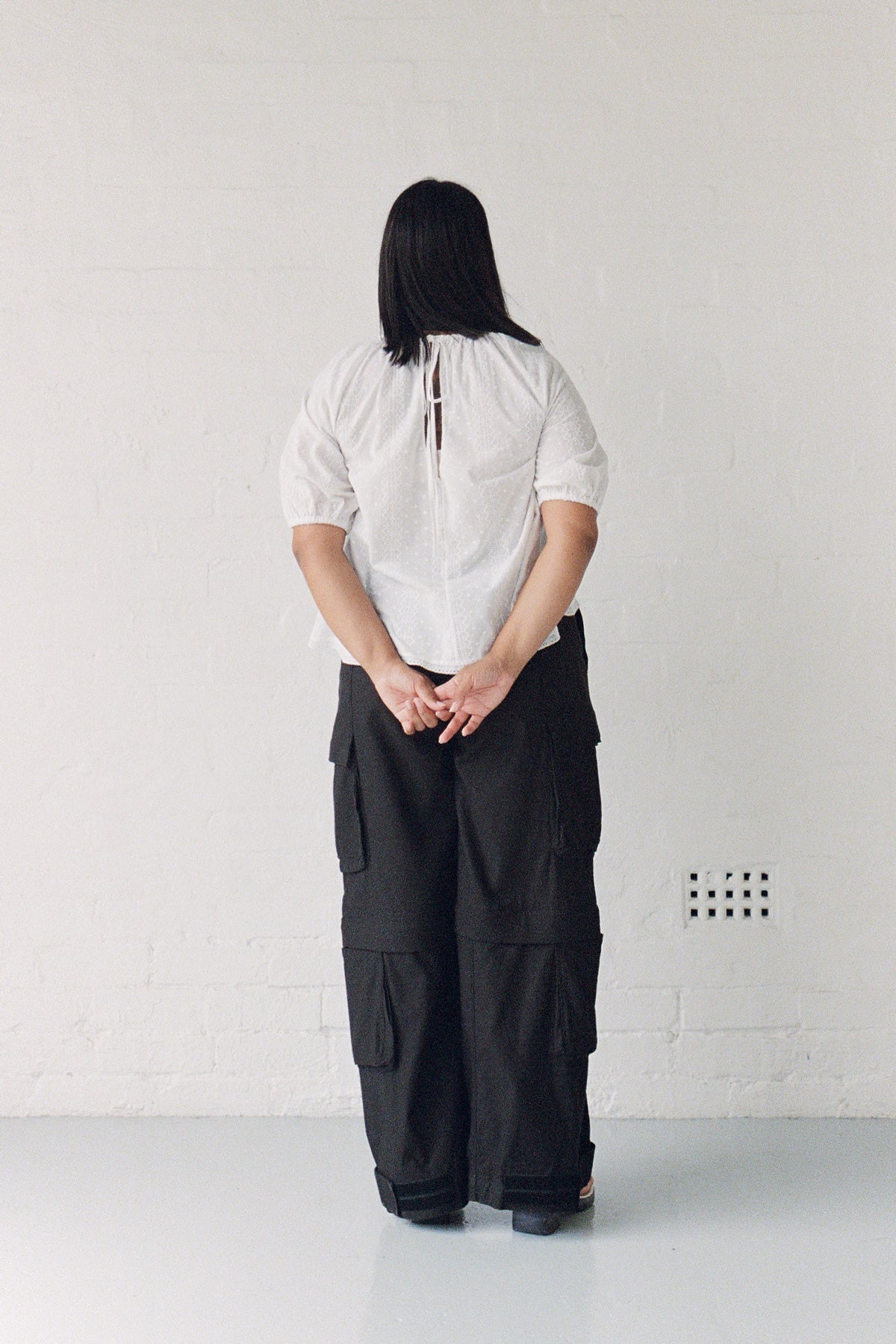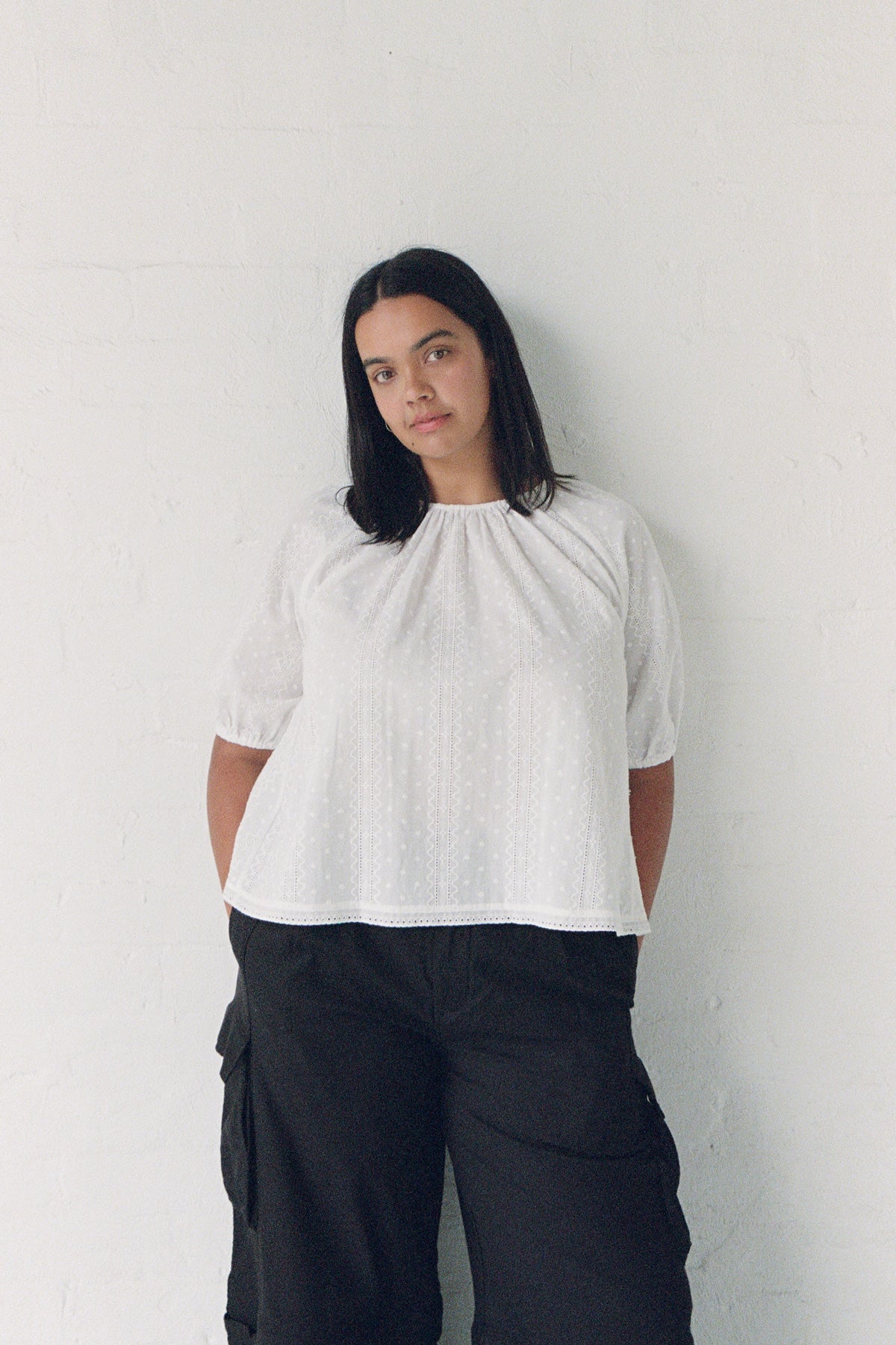 A-line, short sleeve raglan top in white broderie cotton.