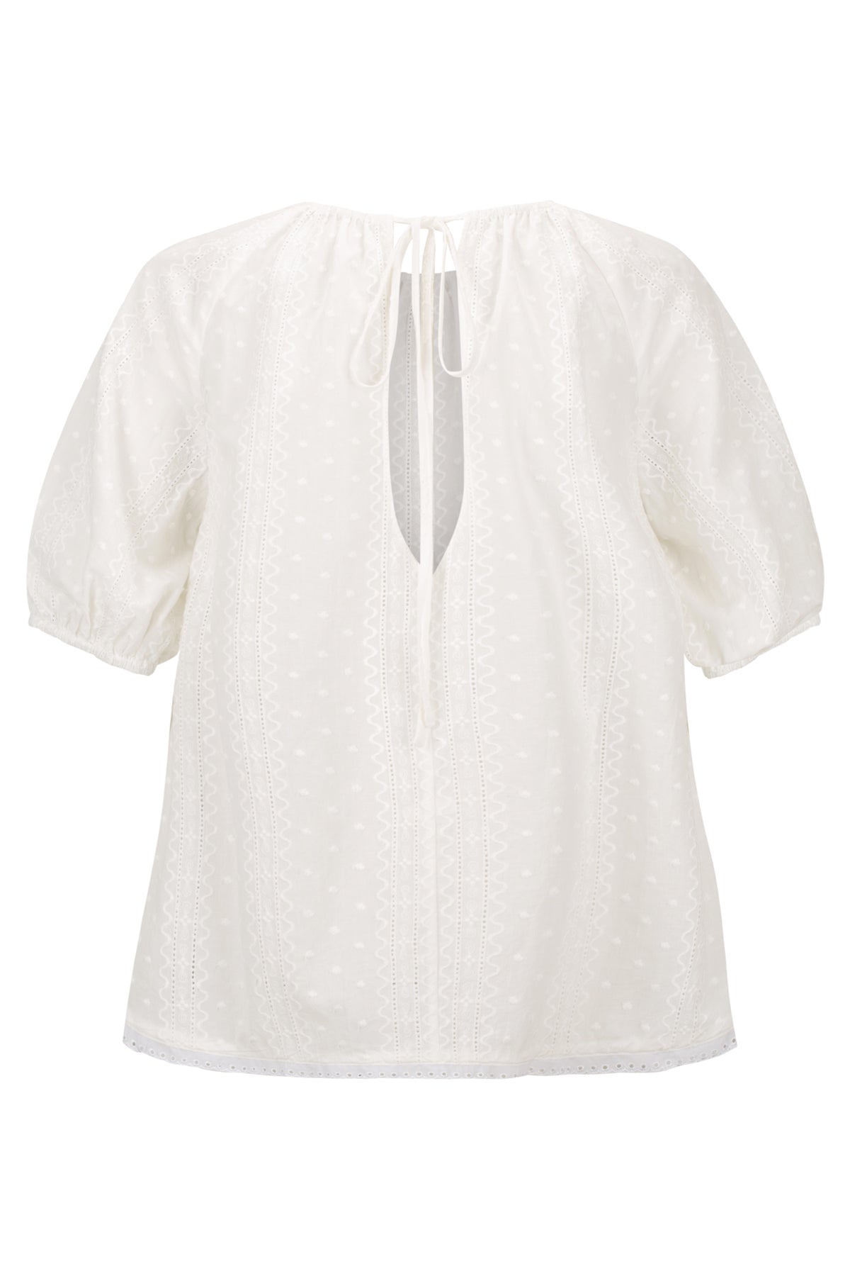A-line, short sleeve raglan top in white broderie cotton.